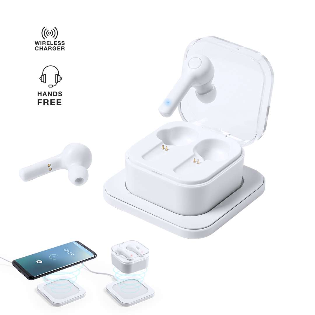 Auricolari Bluetooth® 5.0 con supporto di ricarica wireless 5w, compatibile con i dispositivi dotati di tecnologia di ricarica wireless In elegante finitura bianca e design ergonomico. Dotati di un pulsante di controllo integrato nell'auricolare e di una batteria al litio. Base di ricarica di colore abbinato e spia di stato di ricarica a LED. Funzione vivavoce e ricaricabile, con cavo di ricarica incluso. Confezionate singolarmente in un astuccio deluxe con coperchio incernierato e in un'attraente scatola di design