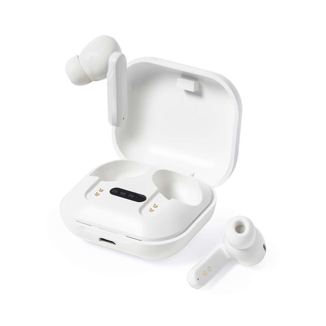 Cuffie in-ear della linea natura, connessione Bluetooth® 5.0, con batteria al litio ed elegante rifinitura bianca. Realizzate in ABS riciclato (RABS) e con certificazione RCS, che garantisce la sua origine riciclata. Dal design ergonomico, includono un pulsante di controllo integrato sull'auricolare, con base di ricarica abbinata e indicatore di stato di carica a LED. Funzione vivavoce e ricaricabile, con cavo micro USB incluso. Confezionate in un'attraente scatola di eco-design.
