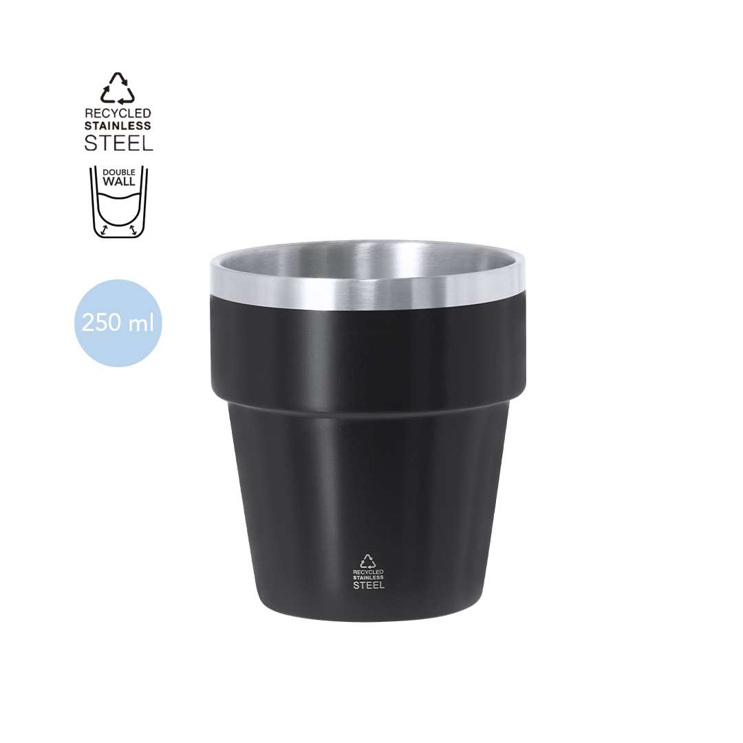 Bicchiere termico realizzato in Acciaio Inox Riciclato a doppia parete e capacità di 250 ml. Rivestimento in colore satinato e bordo e interno in acciaio satinato. Con logo Acciaio Inox Riciclato.L'acciaio è uno dei materiali più richiesti e può essere trovato quasi ovunque, da prodotti di uso quotidiano a grandi costruzioni. Con innumerevoli proprietà, tra cui la durabilità e il suo alto grado di riutilizzo, rendendolo un'alternativa molto valorizzata nelle soluzioni di sostenibilità. Adeguatamente trattato, consente di ottenere nuove risorse di utilizzo infinito.