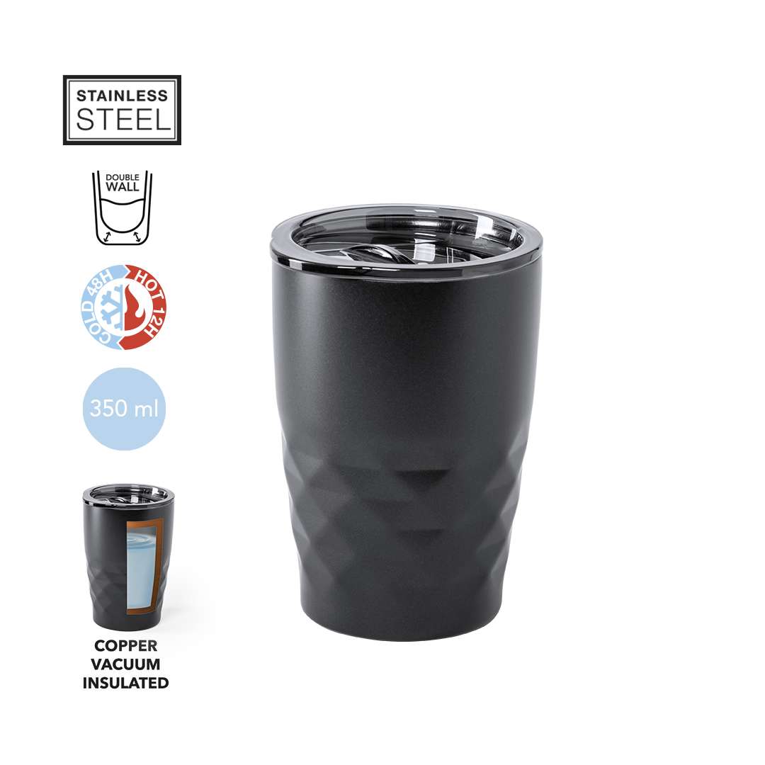 Bicchiere termico da tavolo in acciaio inox, con doppia parete e isolamento sottovuoto in rame, con una capacità di 350 ml. È ideale per la tua scrivania, tavolo o qualsiasi superficie dove puoi goderti la tua bevanda preferita. Consente di mantenere il caldo e il freddo per un tempo più lungo, rispettivamente fino a 8 e 24 ore. Include un coperchio con dispenser e apertura facilitata.
