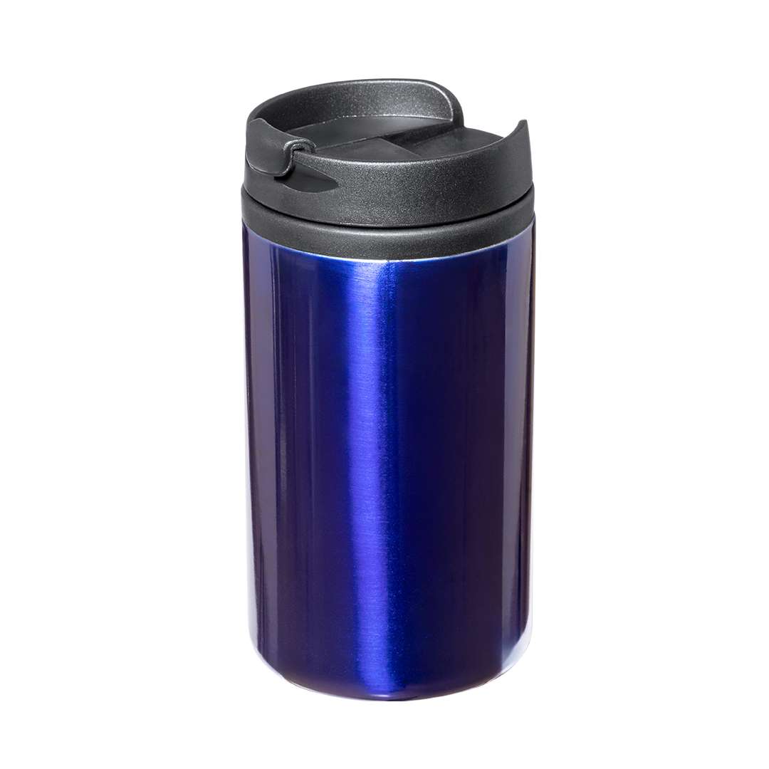 Bicchiere realizzato in acciaio inossidabile con una capacità di 290 ml, con corpo in colori vivaci e finitura lucida. Dotato di un coperchio dosatore nero progettato per evitare perdite, privo di BPA e con una base imbottita in morbida schiuma.
