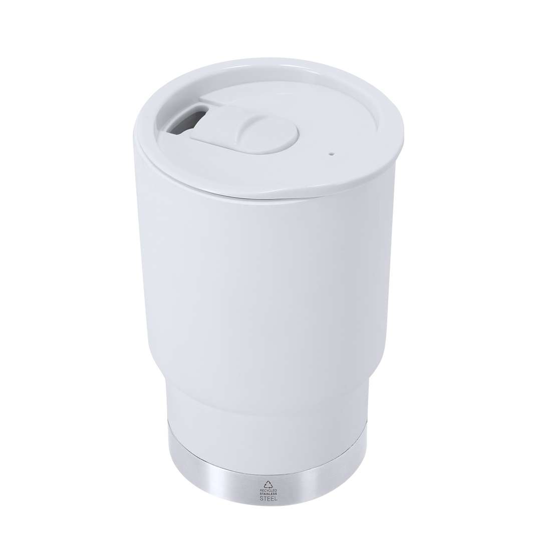 Bicchiere termico da 380 ml. Realizzato in resistente PP Riciclato a doppia parete, in combinazione con base in Acciaio Inox Riciclato. Coperchio con dosatore ad apertura facile, privo di BPA. Perfetto per la scrivania, il tavolo o qualsiasi superficie dove godersi comodamente la propria bevanda preferita. Con certificazione Food Grade, che garantisce la sicurezza a contatto con gli alimenti. Con distintivo in Acciaio Inox Riciclato. Il PP Riciclato è una plastica riciclata e altamente riciclabile, molto resistente e adatta a molteplici applicazioni. Lacciaio è uno dei materiali più richiesti e si trova praticamente ovunque, dai prodotti di uso quotidiano alle grandi costruzioni. Con innumerevoli proprietà, tra cui spiccano la durabilità e lalto grado di riutilizzo, rappresenta unalternativa molto apprezzata nelle soluzioni di sostenibilità. Adeguatamente trattato, consente di ottenere nuove risorse di utilizzo infinito.