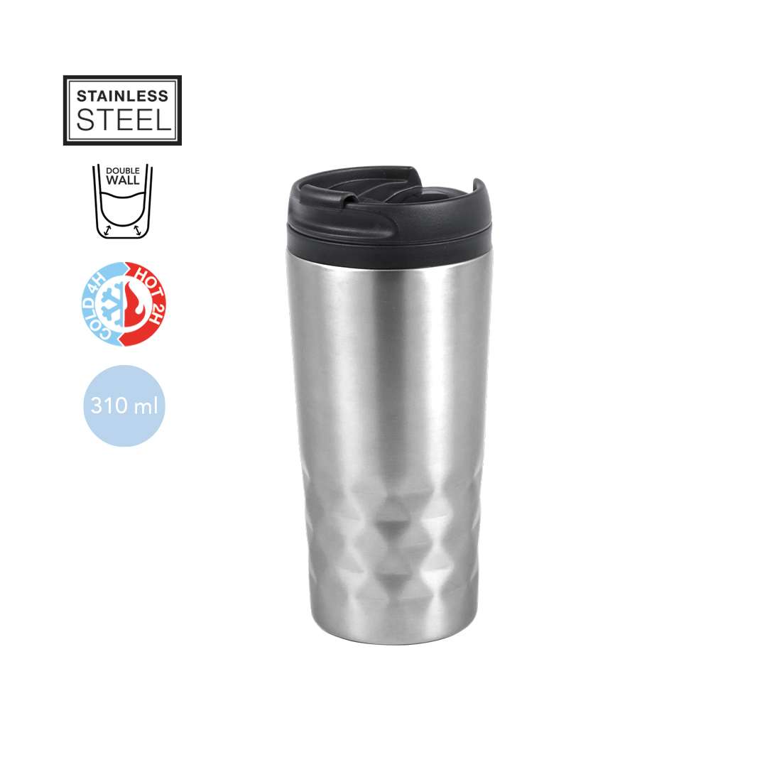 Bicchiere da tavolo in acciaio inox con capacità di 310 ml. Con coperchio dispenser ad apertura facilitata e base imbottita in morbida schiuma. È ideale per la tua scrivania, tavolo o qualsiasi superficie dove puoi goderti la tua bevanda preferita. Con originale finitura lucida e design a rombi.