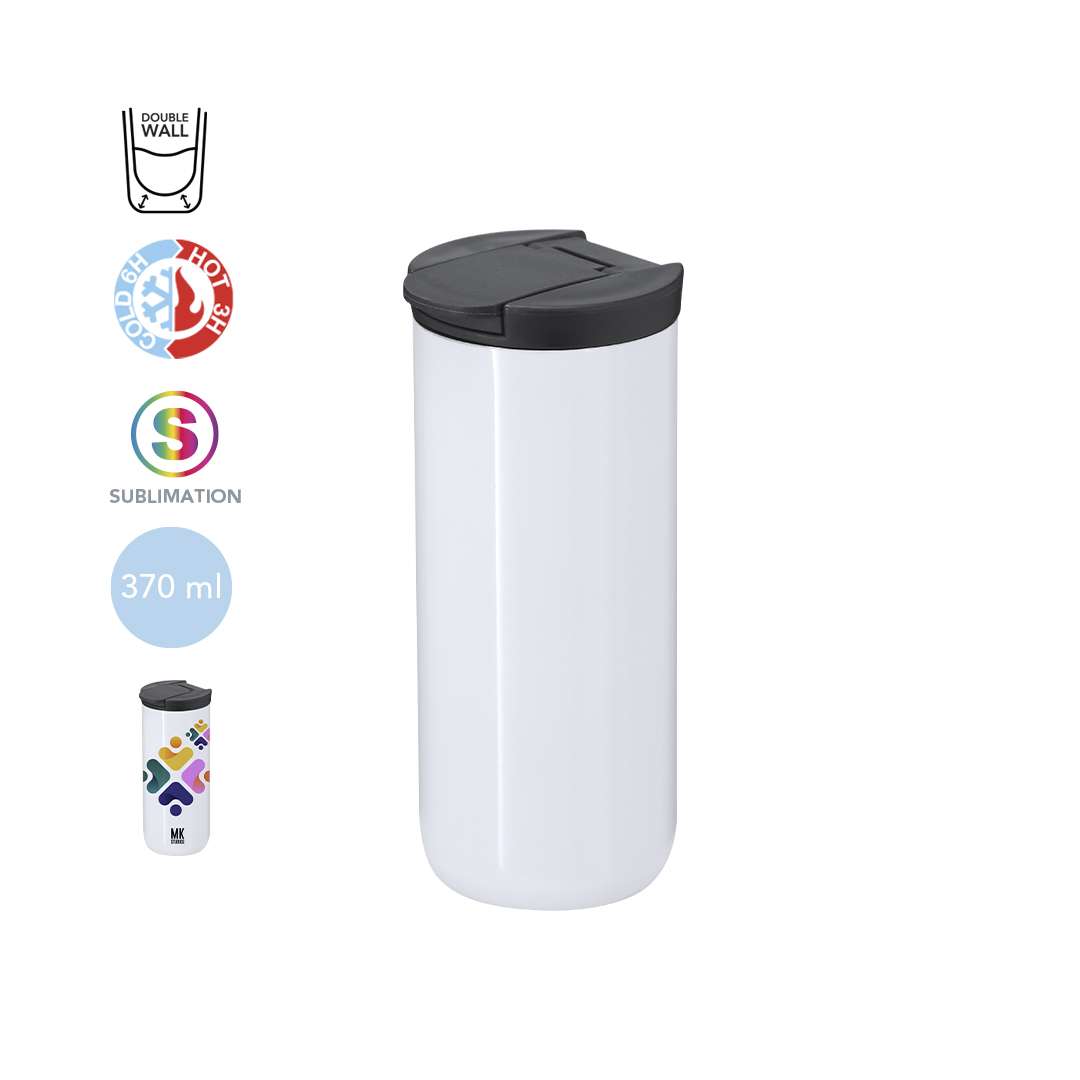 Vaso termico realizzato in acciaio inox a doppia parete e capacità di 370 ml. Progettato specificamente per la marcatura in sublimazione, finitura bianca lucida. Dotato di un dosatore sul coperchio di colore nero, progettato per evitare perdite e privo di BPA.