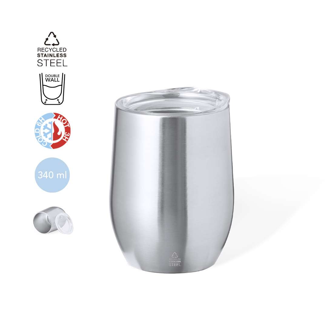 Bicchiere termico da tavolo in acciaio inox riciclato, a doppia parete e con capacità di 340 ml. Include coperchio trasparente con chiusura a scatto e dispenser. È ideale per la tua scrivania, tavolo o qualsiasi superficie dove puoi goderti la tua bevanda preferita. Con logo Recycled Stainless Steel. L'acciaio è uno dei materiali più ricercati e si trova praticamente ovunque, dai prodotti di uso quotidiano alle grandi costruzioni. Le sue innumerevoli proprietà, tra cui la durata e l'alto grado di riutilizzabilità, lo rendono un'alternativa molto apprezzata per le soluzioni di sostenibilità. Opportunamente trattato, consente di ottenere nuove risorse di uso infinito.