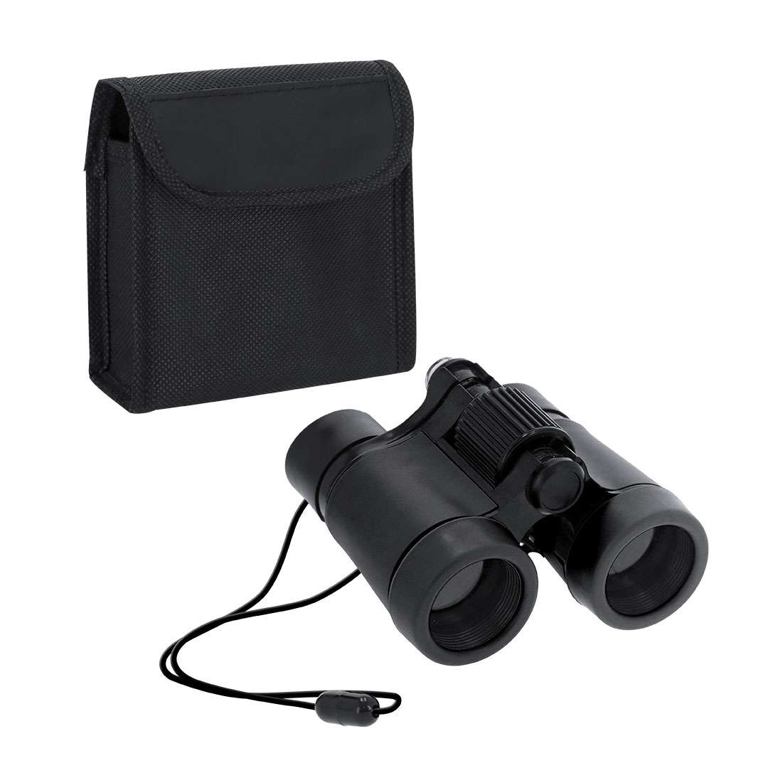 Binocolo regolabile di lungo raggio con lenti in vetro e corpo in resistente ABS. Con zona di supporto morbida e confortevole attorno agli occhi. Con bussola e cordino con sistema anti-squilibrio. Include custodia con chiusura in velcro e cintura.