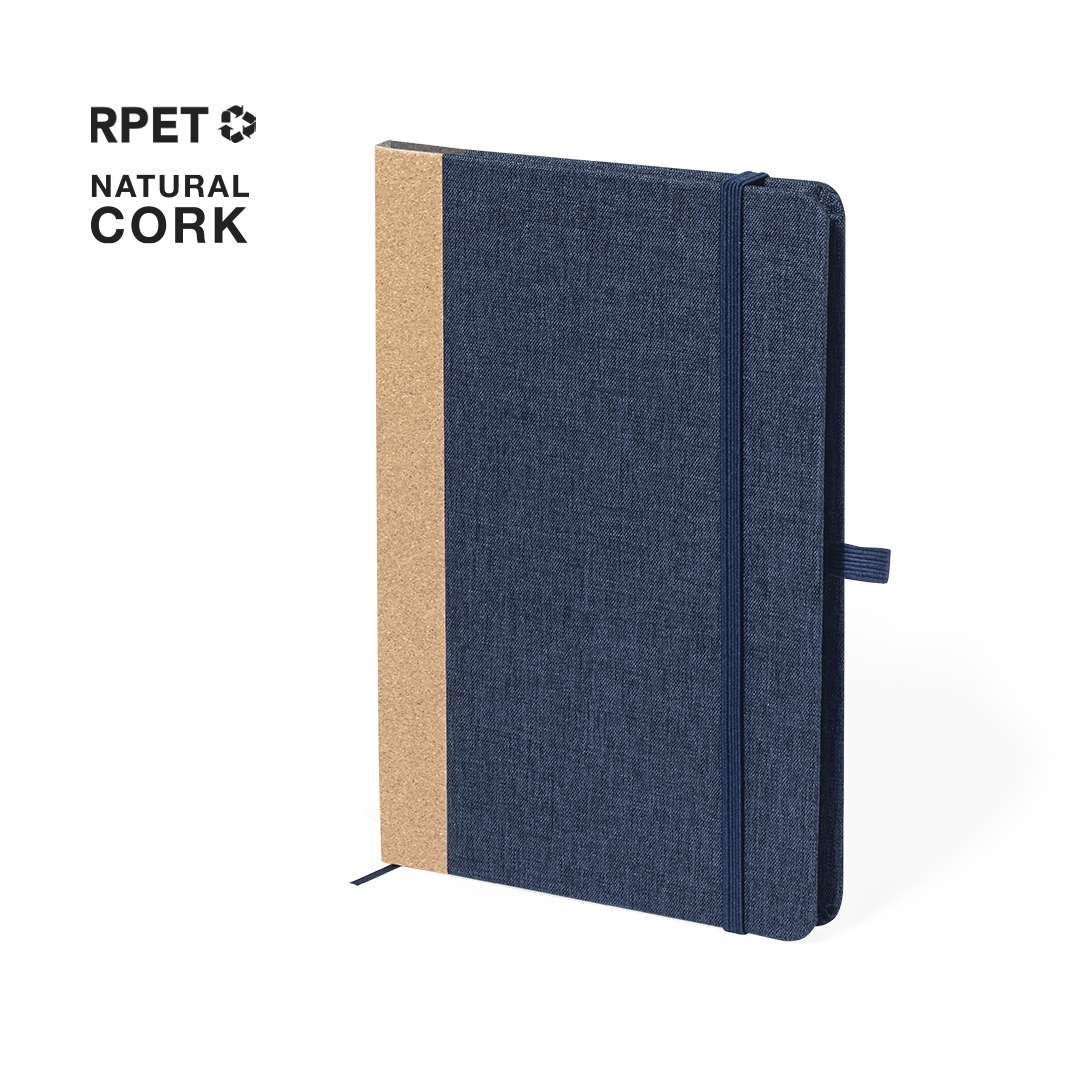 Block notes con copertina rigida in RPET e dorso in sughero. Include interni con 80 pagine lisce, segnalibro, chiusura elastica e portapenne abbinato. Logo RPET sul retro della copertina e disponibile in colori eleganti. Presentato in un sacchetto individuale di carta riciclata.Il materiale RPET è realizzato con plastica riciclata per incoraggiare il riutilizzo dei rifiuti plastici e contribuire alla sostenibilità del pianeta.