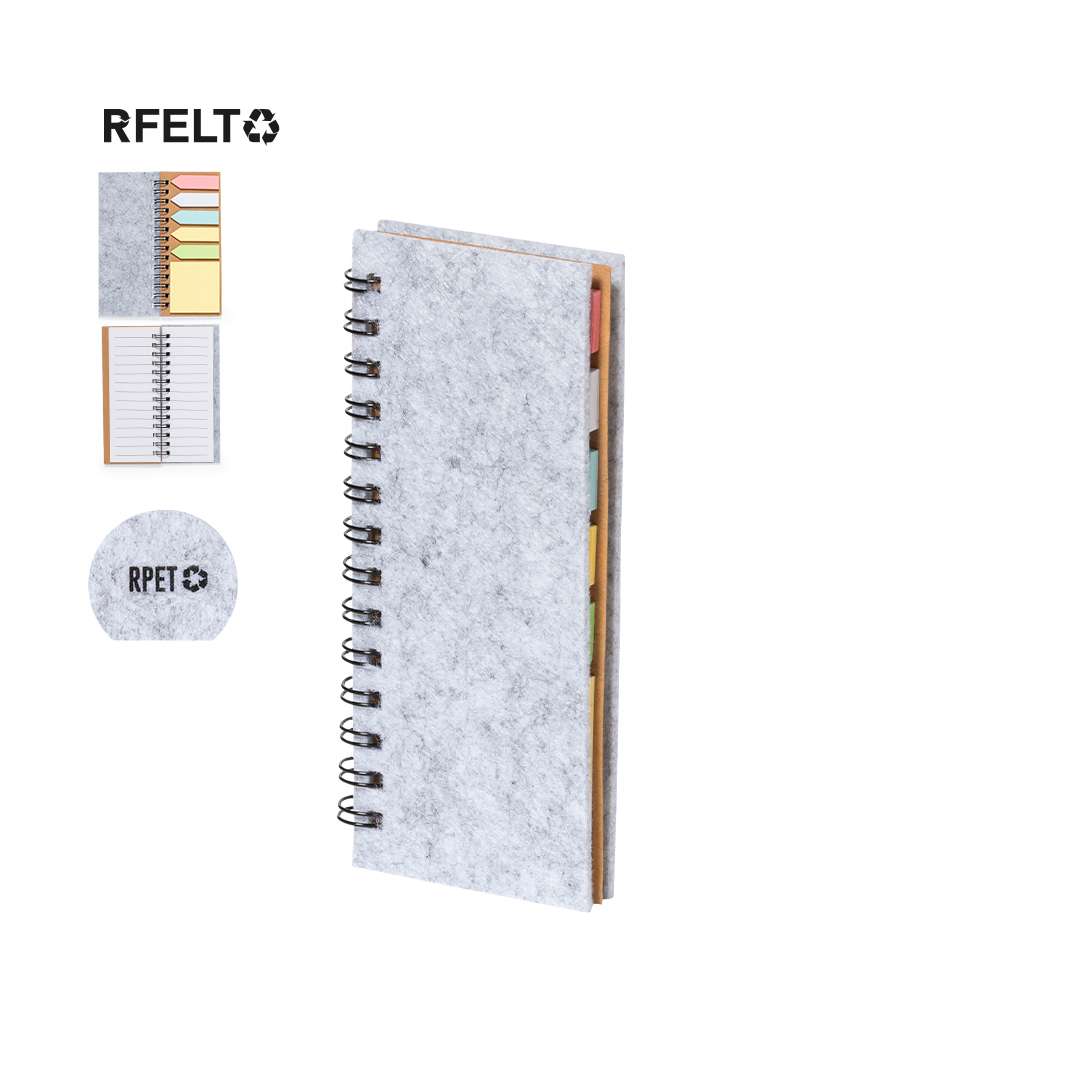 Block notes in morbido feltro RPET. Con logo RPET sulla copertina. Include:Raccoglitore ad anelli da 30 fogli bianchi con layout a righe e etichetta riciclato su entrambi i lati.25 note adesive medie.125 mini note adesive in vari colori.Presentato in un sacchetto individuale riciclato.