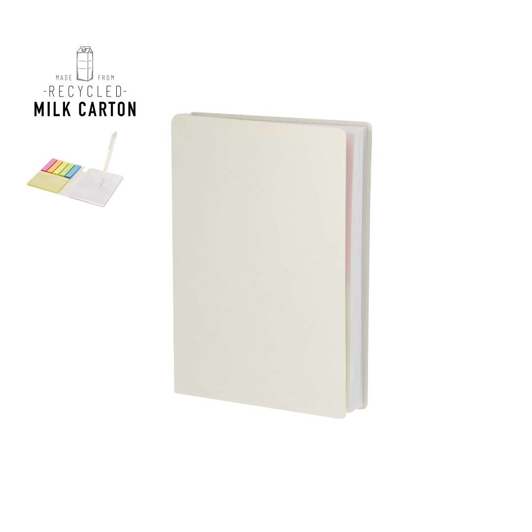 Blocco note con copertine realizzate in cartoni di latte riciclati. Con copertine morbide e interno con 50 note adesive quadrate e 125 mini note adesive di vari colori. Include distintivo Recycled Milk Carton.I cartoni di latte sono composti in maggior parte da cartone e alluminio. Durante il loro processo di riciclaggio, i vari materiali del contenitore vengono separati per il loro riutilizzo e nuovo utilizzo, contribuendo così a percorrere l'infinito cammino dell'economia circolare. Questo materiale si caratterizza per il suo alto grado di riciclabilità, così come per la sua leggerezza e resistenza.50 Note Adesive 7,5 x 7,5 cm. 125 Mini note adesive 1,5 x 5 cm.
