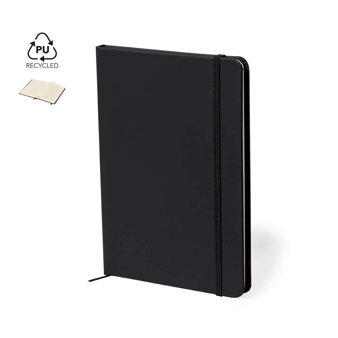 " Block notes con copertina rigida in similpelle riciclata in diversi colori. All'interno 100 fogli con layout a righe. Include chiusura elastica dello stesso colore. Con logo similpelle riciclata. Presentato in un sacchetto individuale riciclato.La similpelle si distingue per la sua resistenza ed elasticità. Questo materiale riciclato e riciclabile è un'opzione sostenibile che recupera le fibre scartate nei processi di produzione, minimizzando così lo spreco di materiale e contribuendo a sua volta a ridurre l'impatto ambientale, pur mantenendo le sue proprietà originali".
