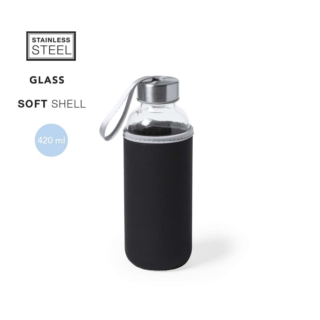 Borraccia in vetro da 420 ml. Con tappo di sicurezza a vite e comoda cinghia per il trasporto, è dotata di un'elegante custodia in neoprene dai colori vivaci. Confezionata singolarmente in una scatola di design.