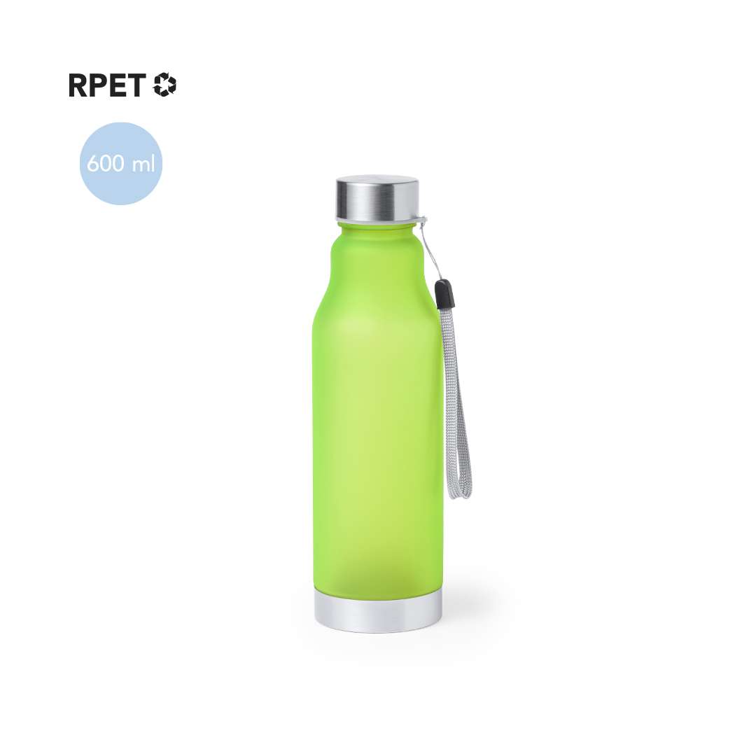 Borraccia con capacità di 600 ml. Senza BPA, con corpo in RPET ricavato da plastica riciclata, per promuovere il riutilizzo dei rifiuti plastici e contribuire alla sostenibilità del pianeta. Tappo a vite in acciaio inox, con cavo di trasporto e base coordinati. Disponibile in un'ampia gamma di colori.