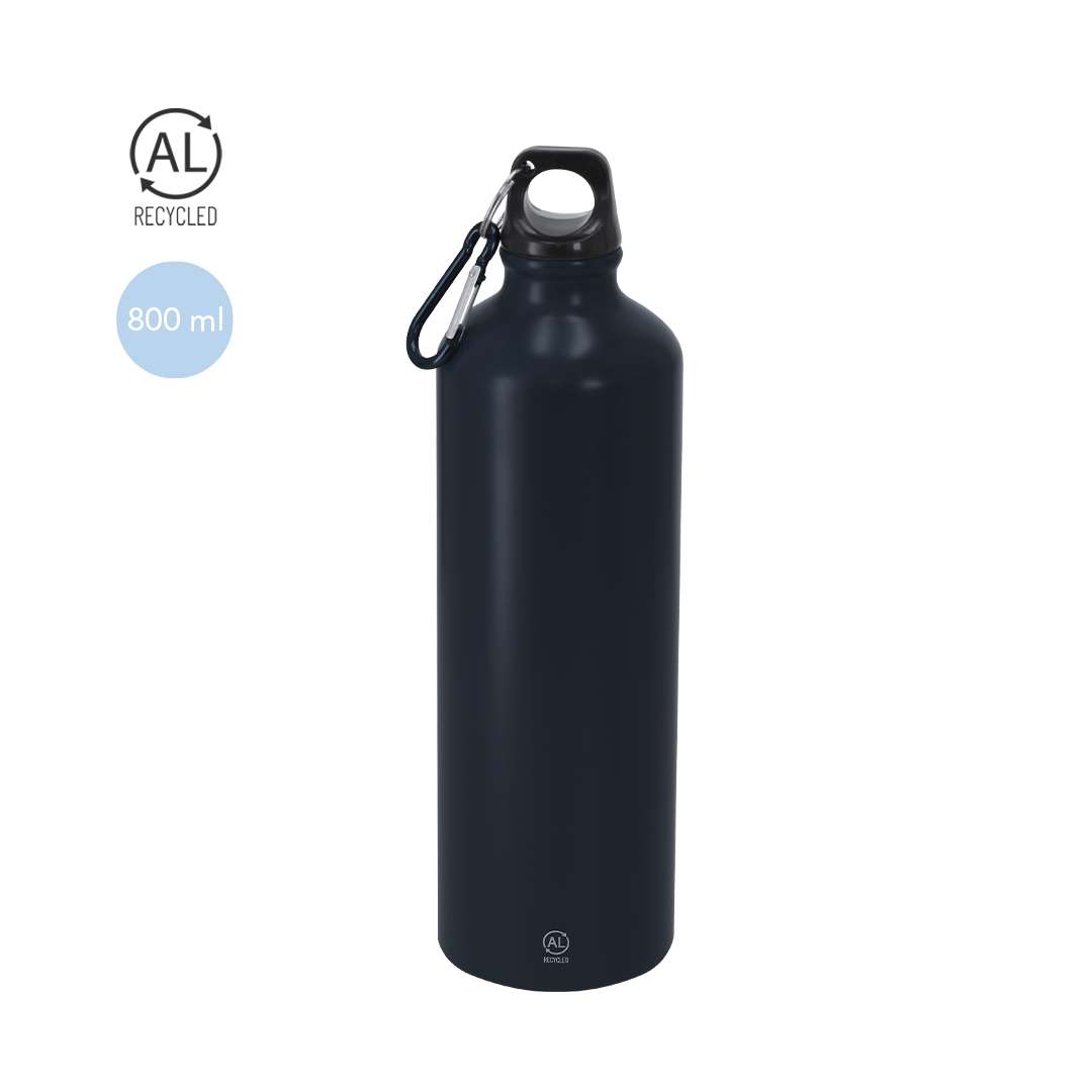 Bottiglia da 800 ml di capacità. Realizzata in alluminio riciclato resistente e sostenibile. Con tappo a vite nero e moschettone abbinato per un facile trasporto. Corpo con finitura satinata. Priva di BPA. Include distintivo Alluminio Riciclato. L'alluminio riciclato è un materiale con possibilità di riciclo quasi infinite, senza perdere le sue proprietà originali e consumando meno energia in questo processo.