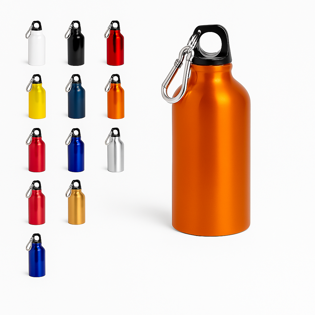 Borraccia da 400 ml con corpo in alluminio in un'ampia gamma di colori brillanti. Con tappo di sicurezza a vite e moschettone in metallo per il trasporto. Confezionata singolarmente in una scatola dal design accattivante."