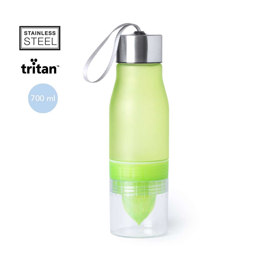 Bidone originale con capacità di 700 ml, realizzata in materiale tritan resistente al calore e senza BPA. Include una base con spremiagrumi per aromatizzare l'acqua. Con dispenser, tappo a vite e cinghia di trasporto. Disponibile in una vasta gamma di colori e presentato in una scatola individuale
