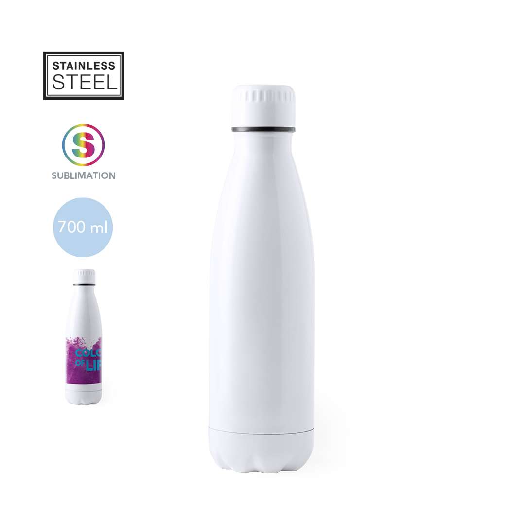 Borraccia per la sublimazione da 700 ml con corpo in acciaio inox di colore bianco lucido. Con tappo di sicurezza. Presentata in un'attraente scatola di design.