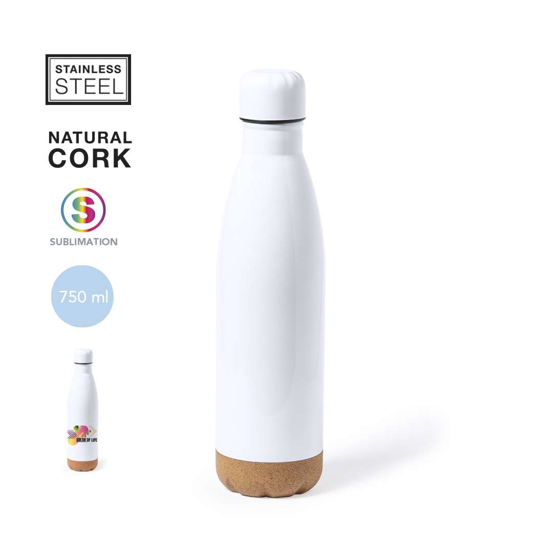 Borraccia con capacità da 750 ml, realizzata in acciaio inossidabile e appositamente progettata per la stampa in sublimazione. Finitura bianca lucida, con tappo a vite abbinato e base in sughero naturale. BPA-free e confezionata singolarmente in scatola dal desing kraft.Manuale di istruzioni disponibile in spagnolo e inglese.