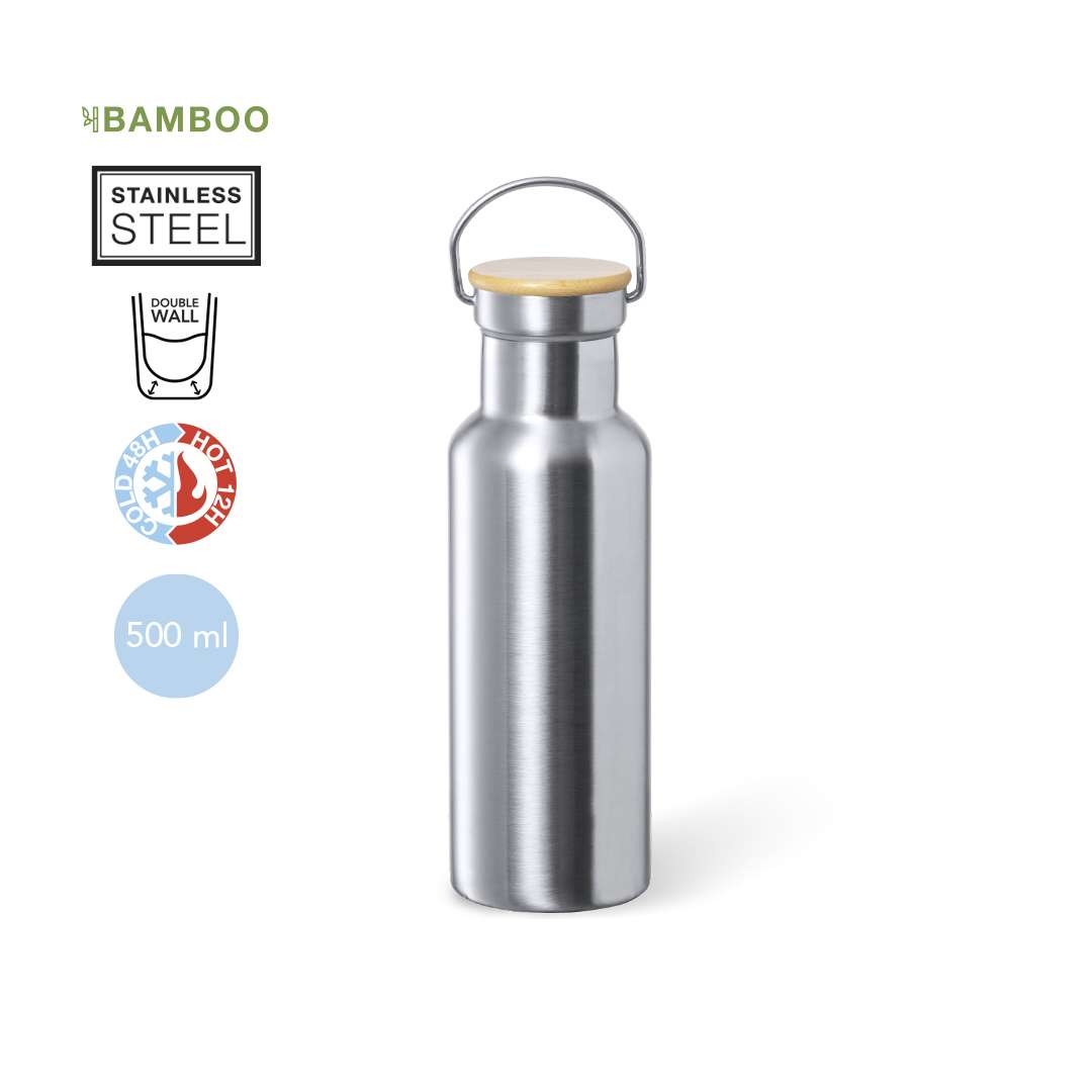 Borraccia thermos da 500 ml, in acciaio inox a doppia parete con finitura opaca. Include il tappo a vite originale in acciaio inox con dettagli in bambù e manico integrato. Priva di BPA e presentata in una scatola kraft individuale.