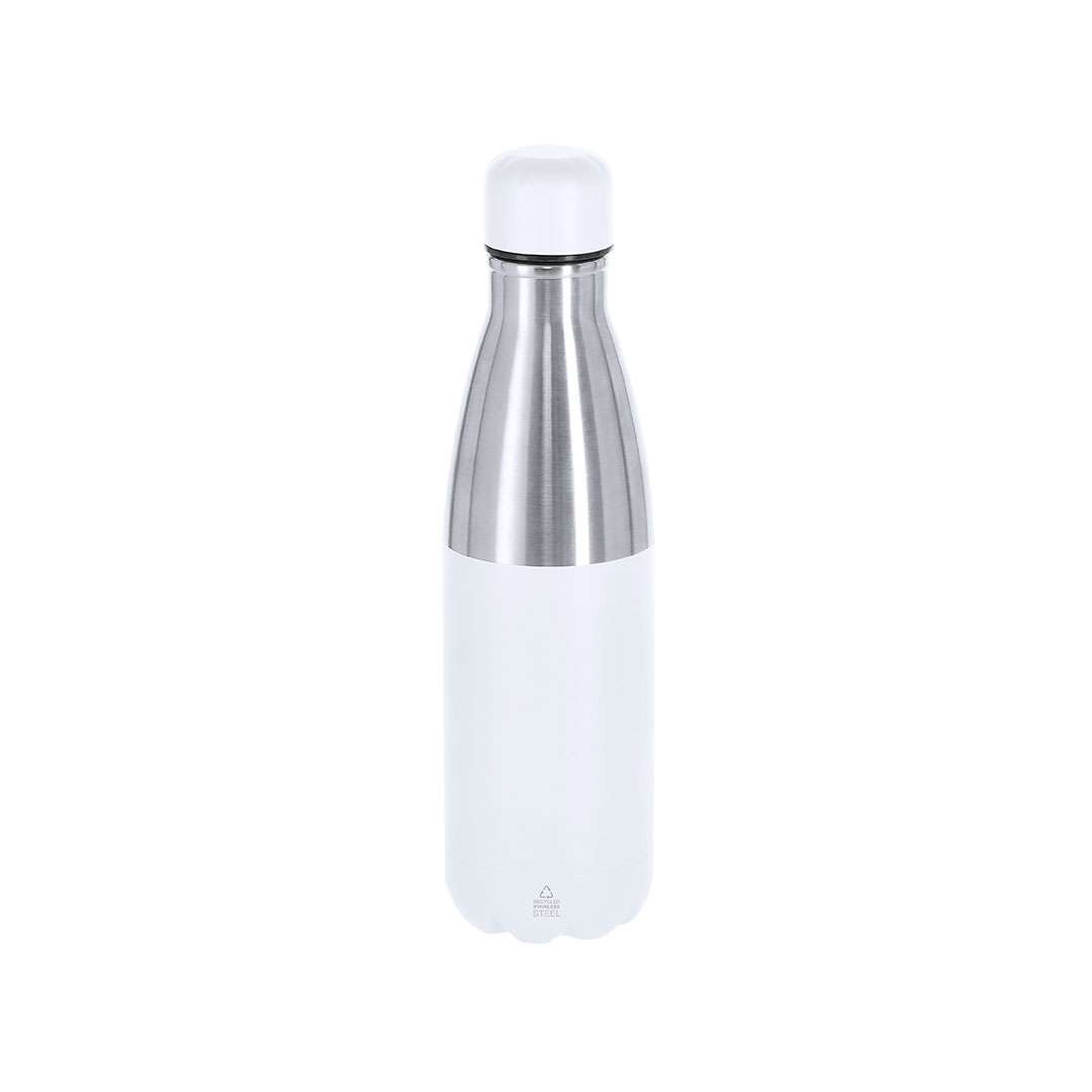 Bottiglia termica da 550 ml di capacità, realizzata in acciaio inox riciclato a doppia parete. Il suo design combina un corpo con finitura silver con tappo a vite e base di colore opaco abbinato. Priva di BPA. Include distintivo di acciaio inox riciclato.L'acciaio è uno dei materiali più richiesti e che può essere trovato quasi ovunque, da prodotti di uso quotidiano a grandi costruzioni. Con innumerevoli proprietà, tra cui la durabilità e l'elevato grado di riutilizzo, lo rende un'alternativa molto apprezzata nelle soluzioni di sostenibilità. Adeguatamente trattato, consente di ottenere nuove risorse di utilizzo infinito.