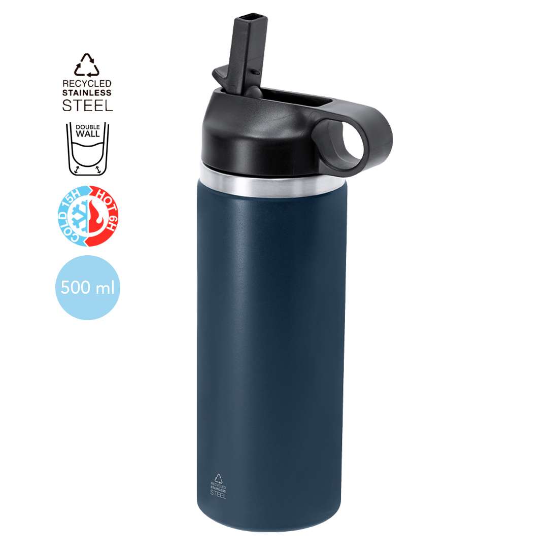 Borraccia da 500 ml realizzata in Acciaio Inox Riciclato a doppia parete, che garantisce una migliore e più duratura conservazione della temperatura. Sistema di facile apertura con dosatore a cannuccia (senza BPA) e manico per il trasporto abbinato. Con distintivo in Acciaio Inox Riciclato. Lacciaio è uno dei materiali più richiesti e si trova praticamente ovunque, dai prodotti di uso quotidiano alle grandi costruzioni. Con innumerevoli proprietà, tra cui spiccano la durabilità e lalto grado di riutilizzo, rappresenta unalternativa molto apprezzata nelle soluzioni di sostenibilità. Adeguatamente trattato, consente di ottenere nuove risorse di utilizzo infinito.