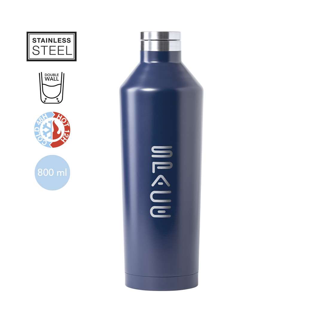 Borraccia termica in acciaio inossidabile, con isolamento a doppia parete e rame sottovuoto, che permette di mantenere il caldo e il freddo per un tempo più lungo, rispettivamente fino a 12 e 48 ore. Capacità da 800ml, con tappo di sicurezza senza BPA e disponibile in una gamma di colori metallizzati. Confezionata in scatola dal design accattivante.