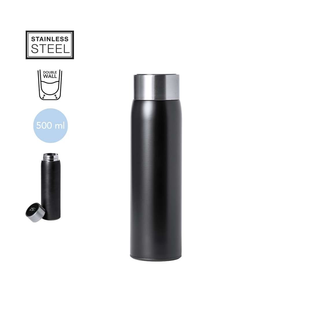 Borraccia termica in acciaio inossidabile a doppia parete, con indicatore di temperatura touch integrato nel tappo. Capacità di 500 ml e finitura opaca. Con tappo di sicurezza senza BPA. Confezionata in scatola dal design attraente. Alimentazione a batteria (pila a bottone inclusa) e manuale d'istruzioni disponibile in inglese e spagnolo.