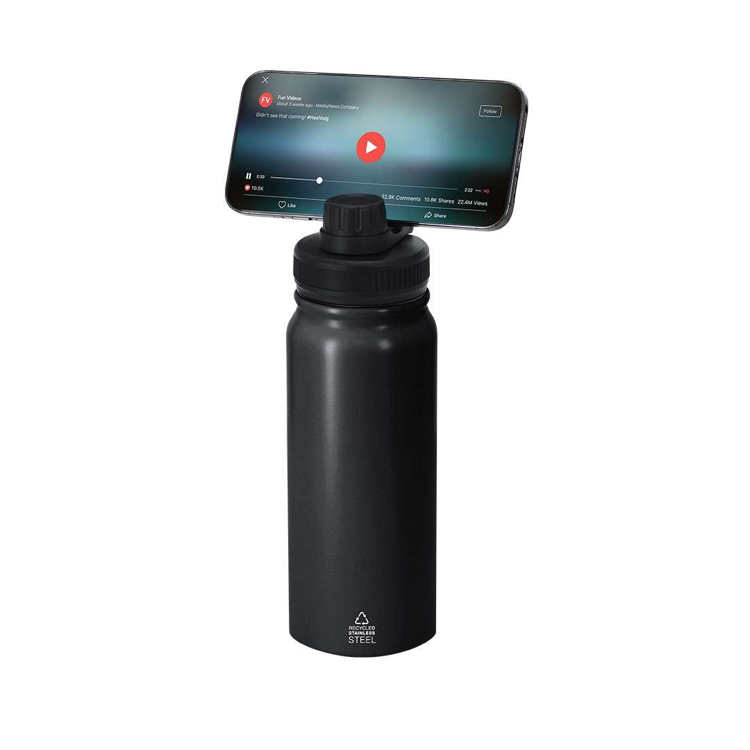 Borraccia Termica da 600 ml di capacità, realizzata in Acciaio Inox Riciclato a doppia parete. Con funzione di supporto magnetico rotante per smartphone. Priva di BPA. Include distintivo di acciaio inox riciclato. L'acciaio è uno dei materiali più richiesti e che può essere trovato quasi ovunque, da prodotti di uso quotidiano a grandi costruzioni. Con innumerevoli proprietà, tra cui la durabilità e l'elevato grado di riutilizzo, lo rende un'alternativa molto apprezzata nelle soluzioni di sostenibilità. Adeguatamente trattato, consente di ottenere nuove risorse di utilizzo infinito.