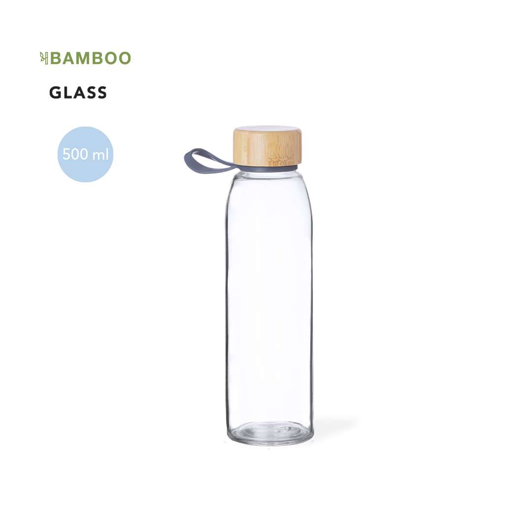 Borraccia in vetro da 500 ml. Tappo a vite in bambù con pratica impugnatura in silicone. Presentata in una scatola dal design kraft.