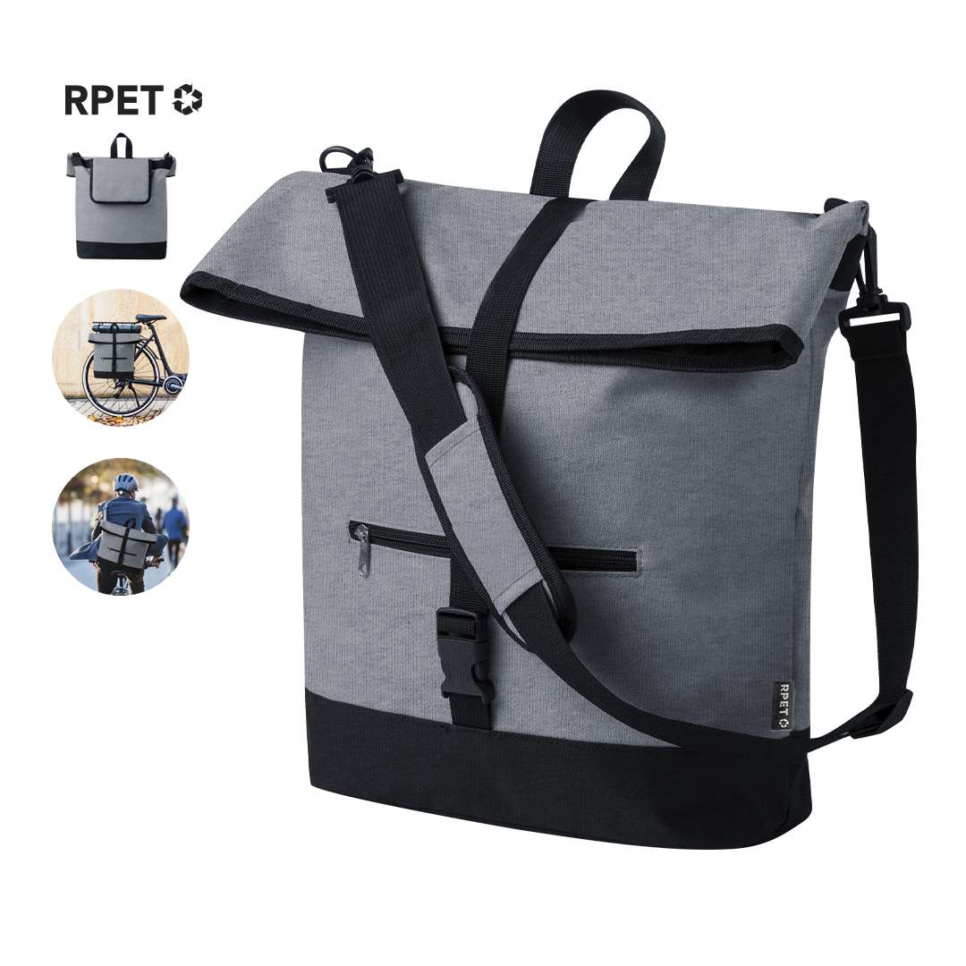 Borsa a tracolla da bicicletta realizzata in resistente 600D RPET. Versatile e con chiusura a fibbia, include una pratica tasca frontale con zip. Sul retro è dotata di specifici attacchi universali per biciclette, che garantiscono maggiore comfort e sicurezza durante gli spostamenti. Inoltre, è dotato di una tracolla imbottita e regolabile, per poterlo trasportare più comodamente quando è sganciato dalla bicicletta. Etichetta esterna con logo RPET. Il materiale RPET è realizzato con plastica riciclata per favorire il riutilizzo dei rifiuti plastici e contribuire alla sostenibilità del pianeta.