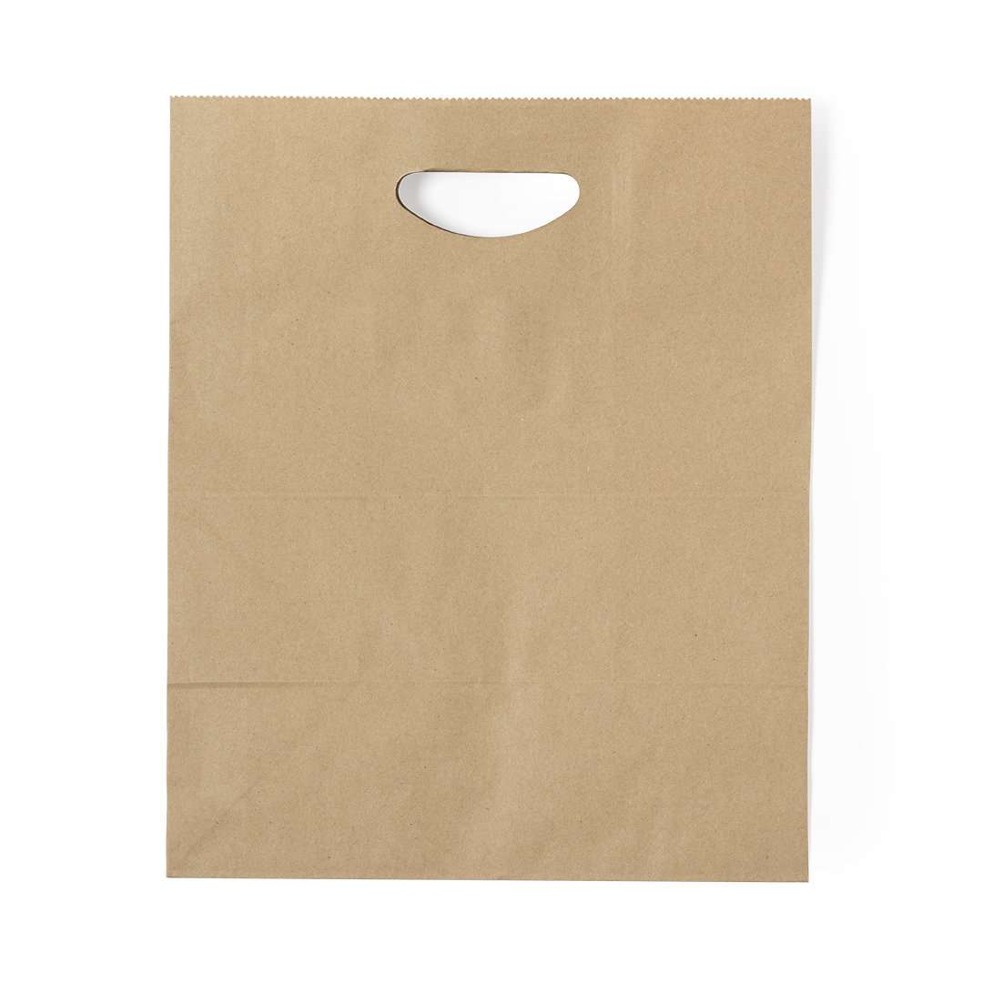 Borsa leggera della linea natura, realizzata in carta riciclata da 80g/m2. Con originali manici ritagliati e soffietto.