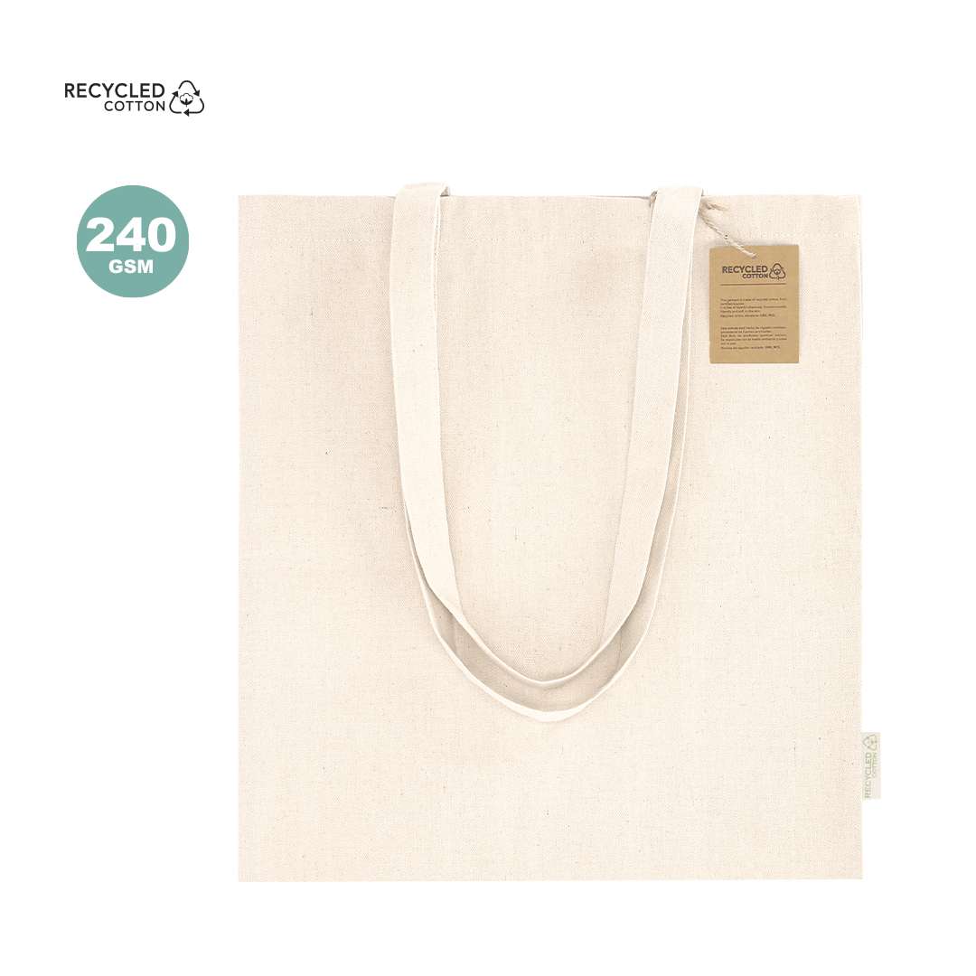 Borsa realizzata principalmente in cotone riciclato di 240 g/m2. Manici lunghi di 70cm con rinforzo, di finitura cucita. Logo in etichetta laterale e resistenza fino a 7 kg di peso.