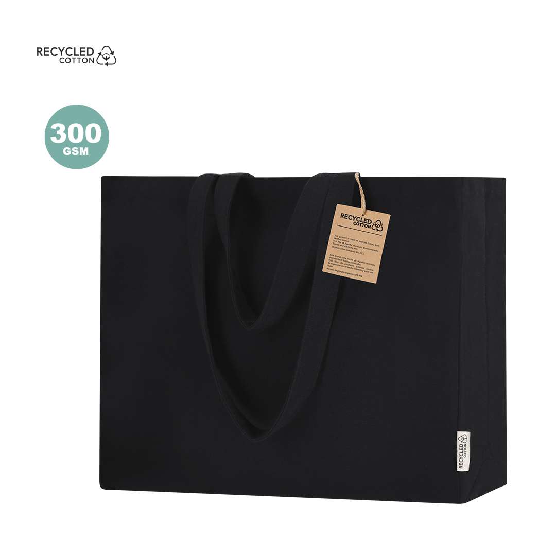 Borsa realizzata principalmente in resistente cotone riciclato di 300g/m2. Finitura cucita con fondo e maniglie lunghe di 70cm rinforzate. Logo sull'etichetta laterale e resistenza fino a 10kg di peso.