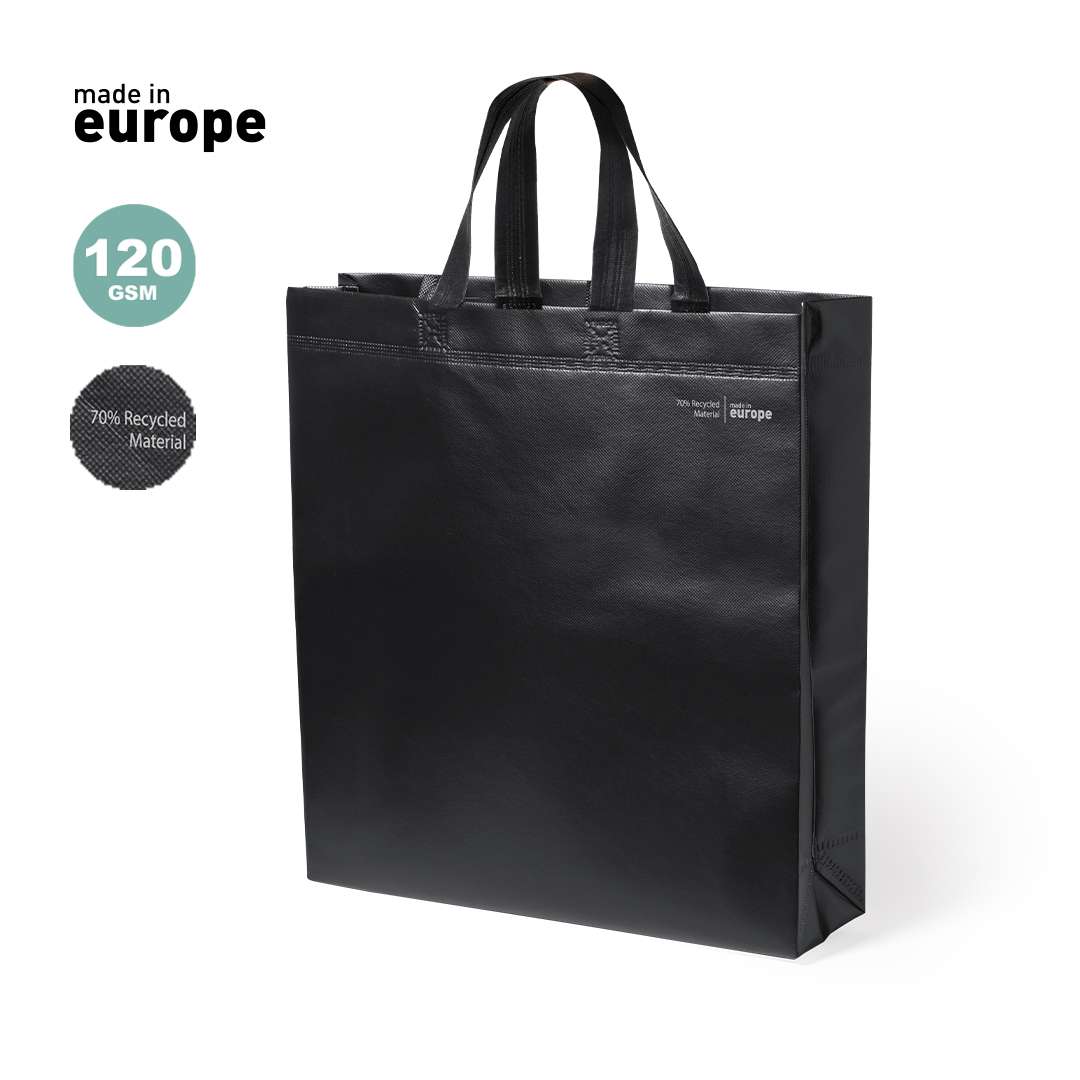 Borsa della linea Natura, realizzata in TNT riciclato 120g/m2 laminato. Prodotta in Europa, con finitura termosaldata, soffietto, manici lunghi ed etichetta eco/made in sulla borsa.