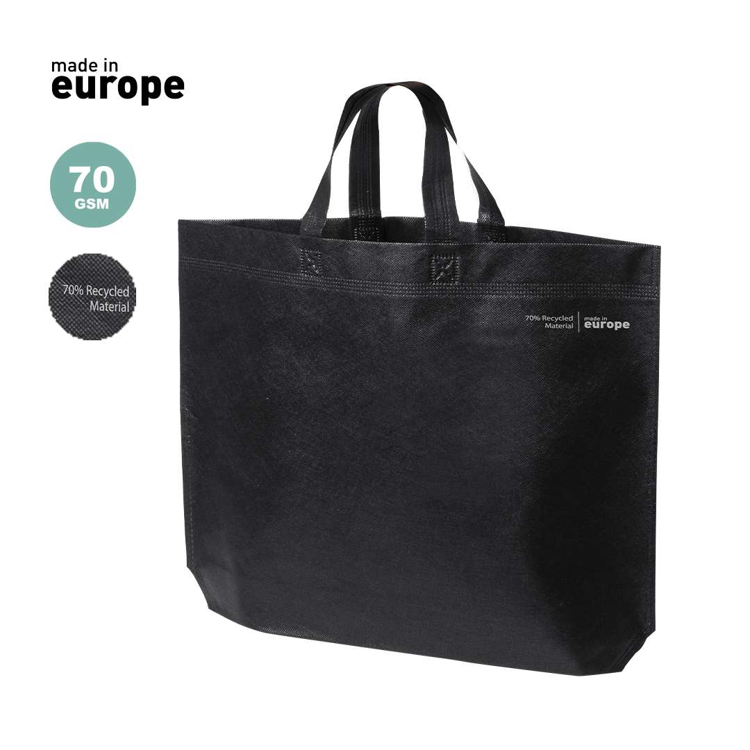 Borsa della linea Natura, realizzata in TNT riciclato da 70g/m2. Prodotta in Europa, con finitura termosaldata, soffietto, manici lunghi ed etichetta eco/made in sulla borsa.