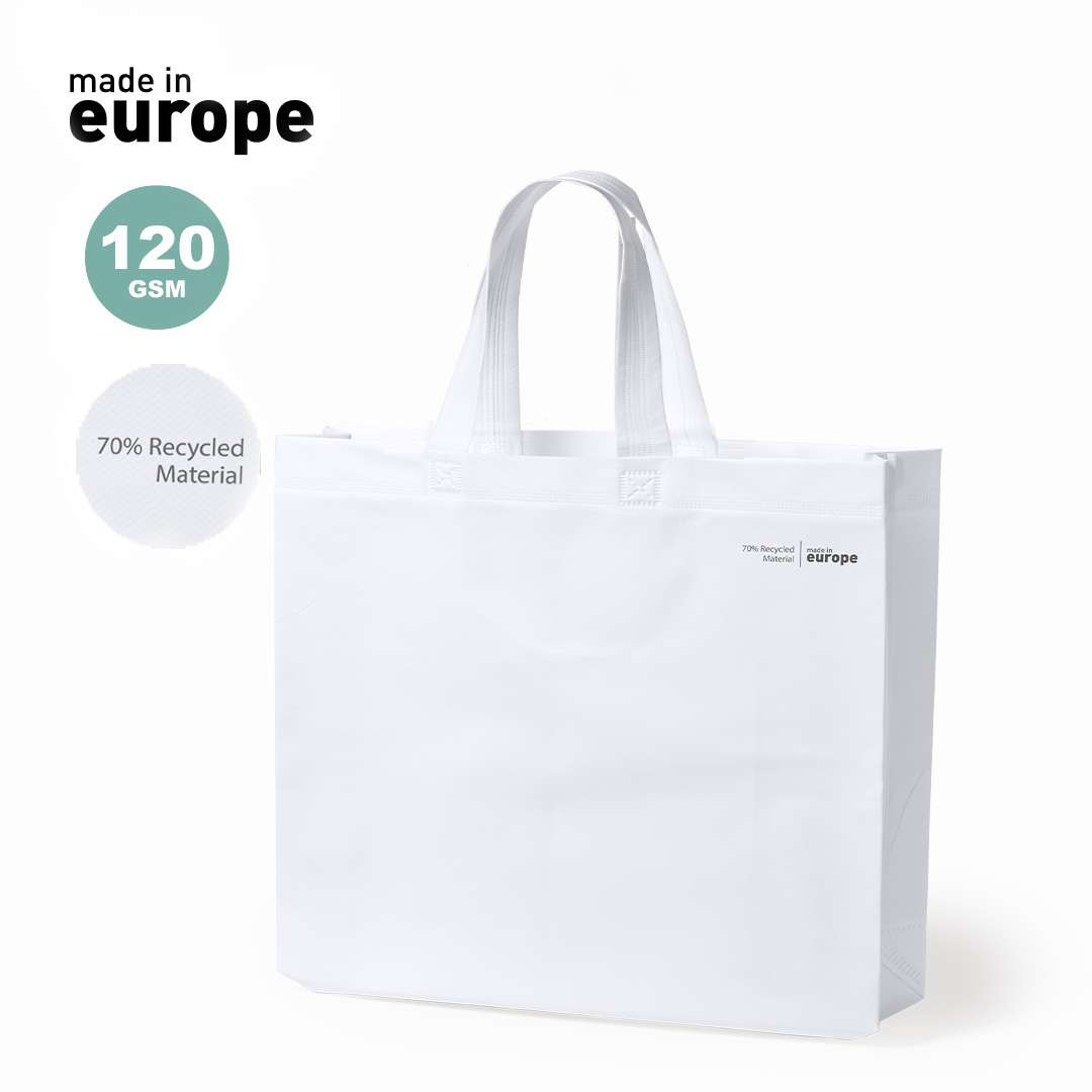 Borsa della linea Natuae, realizzata in TNT riciclato 120g/m2 laminato. Prodotta in Europa, con finitura termosaldata, soffietto, manici lunghi ed etichetta eco/made in sulla borsa.