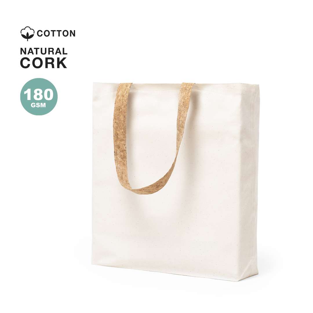 Shopper della linea natura in resistente cotone da 180g/m2 e manici originali in sughero naturale da 53cm rinforzato. Finitura cucita e resistenza fino a 8 kg di peso.