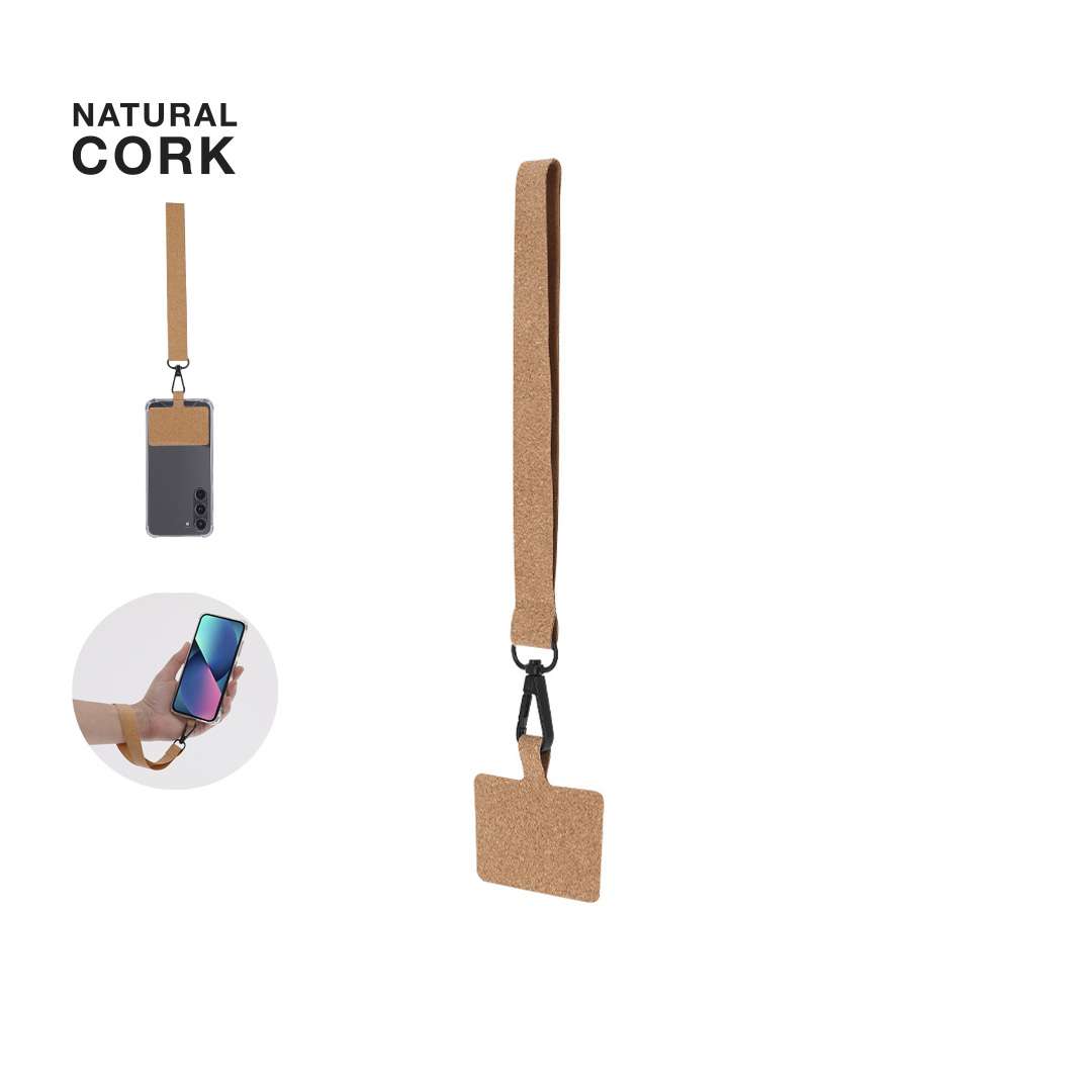 Supporto a braccialetto per smartphone in sughero. Con cinghia da trasporto coordinata e moschettone girevole in metallo nero.Realizzato con elementi a base vegetale per promuovere l'uso di materie prime naturali e ridurre le emissioni inquinanti.