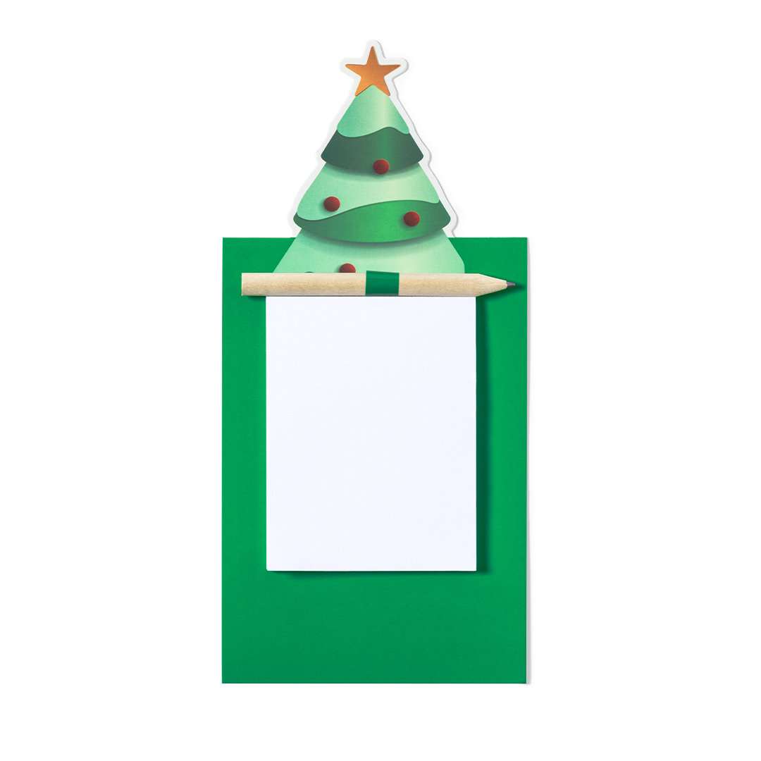 Calamita con block note in un divertente design ad albero di Natale. Include 40 fogli lisci e una matita in legno naturale.