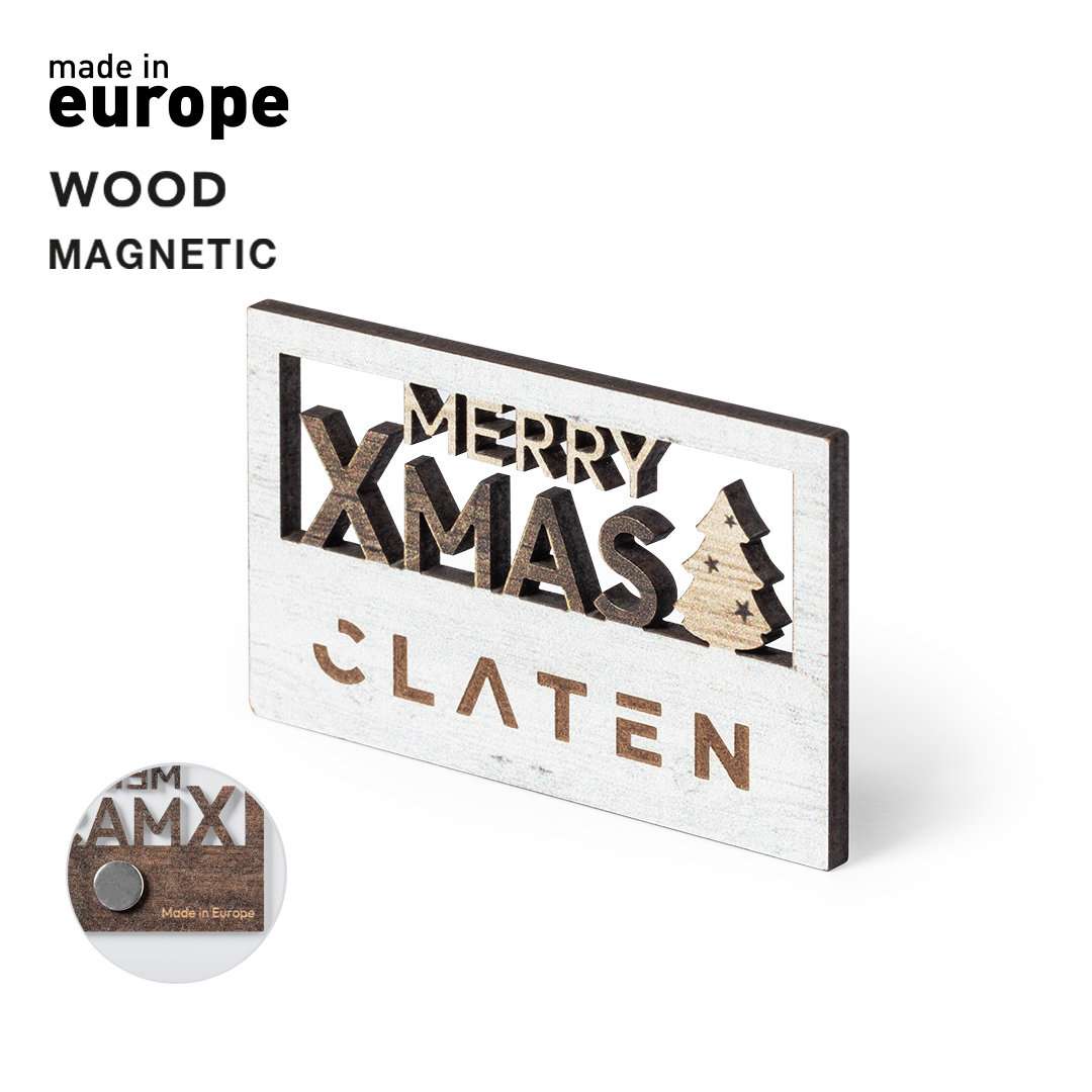 Originale calamita Merry Christmas in legno naturale, con testo fustellato e finitura originale bicolore. Ampia superficie per la stampa e logo Made In Europe.