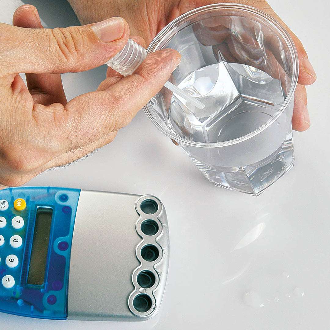 Calcolatrice ecologica a 8 cifre con originale design bicolore e funzionamento ad acqua. Tasti con finitura morbida, dispenser incluso e Confezionata singolarmente in una scatola.