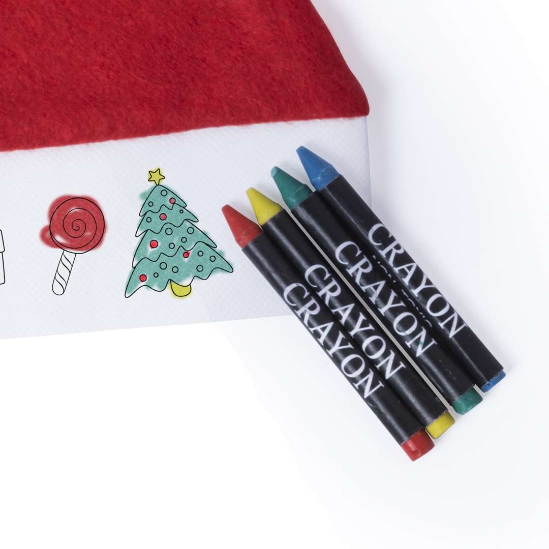 Cappello da Babbo Natale per bambini. Striscia anteriore in TNT bianco con disegni divertenti, appositamente studiato per essere colorato con i pastelli. Include 4 pastelli con corpo cilindrico in colori assortiti.