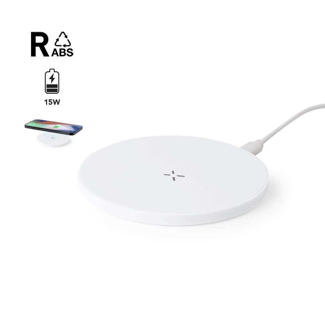 Caricatore wireless da 15W con design circolare realizzato in RABS. Compatibile con i dispositivi dotati di tecnologia di ricarica wireless Qi. Base antiscivolo, con cavo di ricarica di tipo C incluso. Presentato in una scatola individuale dal design kraft, con manuale di istruzioni in inglese e spagnolo.Il RABS è una plastica altamente riciclabile e resistente, con una moltitudine di applicazioni che la rendono una soluzione ecologica. Con certificazione RCS, che ne garantisce l'origine riciclata.Prodotto secondo gli standard RoHS e in conformità ai seguenti requisiti di sicurezza:Sistema di protezione dal surriscaldamento.Sistema di protezione dal sovraccarico.Sistema di blocco per prevenire i cortocircuiti.