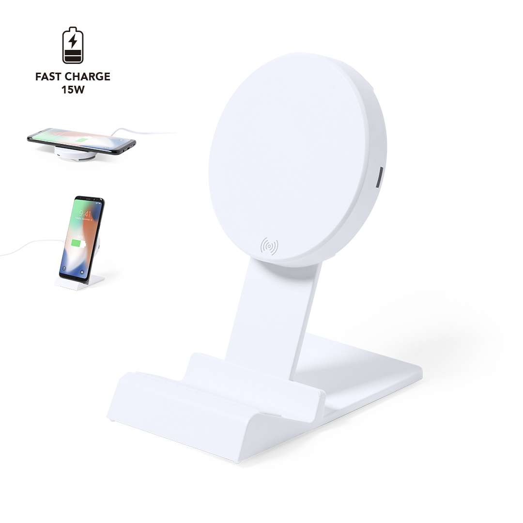 Caricatore wireless a ricarica rapida da 15W. In elegante finitura bianca, con base di ricarica regolabile in altezza e funzione di supporto per smartphone. Compatibile con i dispositivi dotati di tecnologia di ricarica wireless. Cavo di ricarica di tipo C incluso, con ampia area di stampa. Confezionato in una scatola dal design accattivante. Manuale d'istruzioni in inglese e spagnolo disponibile. Conforme ai requisiti di sicurezza:Sistema di protezione dal surriscaldamento.Sistema di protezione da sovraccarico.Sistema di bloccaggio per evitare cortocircuiti