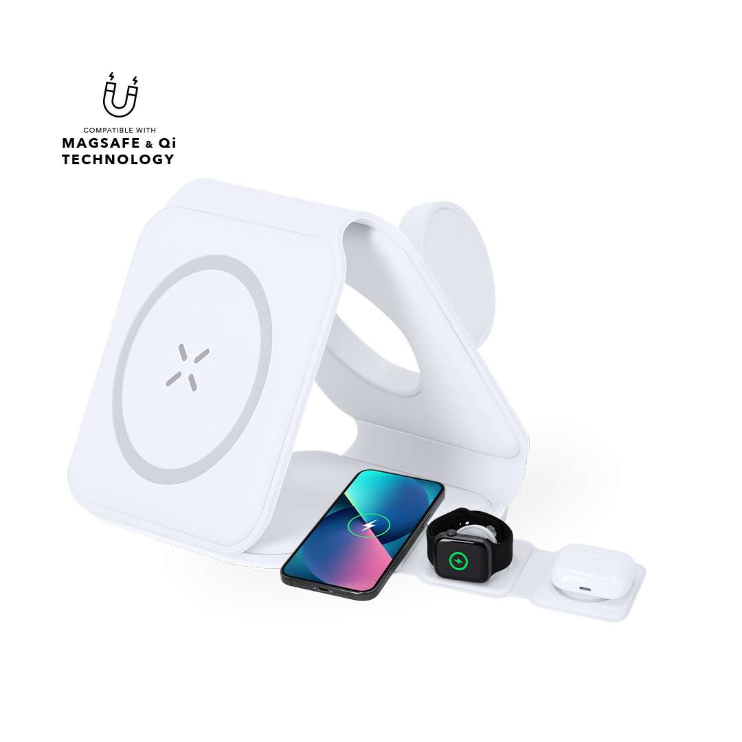 Caricatore wireless magnetico completo 15W, progettato per la ricarica simultanea di smartphone, auricolari e smartwatch. Un gadget tutto-in-uno: pieghevole, portatile, compatto nelle dimensioni, molto versatile e funzionale nel design. Connessione tramite USB Tipo C -cavo incluso- e realizzato in ABS resistente di colore bianco.Prodotto secondo gli standard RoHS e in conformità con i seguenti requisiti di sicurezza:Sistema di protezione contro il surriscaldamento.Sistema di protezione contro il sovraccarico.Sistema di blocco per evitare cortocircuiti.