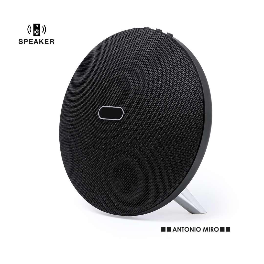 Altoparlante con connessione Bluetooth® dall'elegante finitura nera con accessori argentati e dall'originale design circolare. Offre una potenza di 8W, ha la funzione vivavoce, uno slot per schede micro SD fino a 32 GB di capacità e ingresso di linea ausiliario tramite connessione jack da 3,5 mm. Compatibile con iOS e Android, include un cavo di ricarica mini USB e un cavo jack ausiliario da 3,5 mm ed è confezionato in un'attraente scatola di design. Con piedini in gomma antiscivolo sulla base.