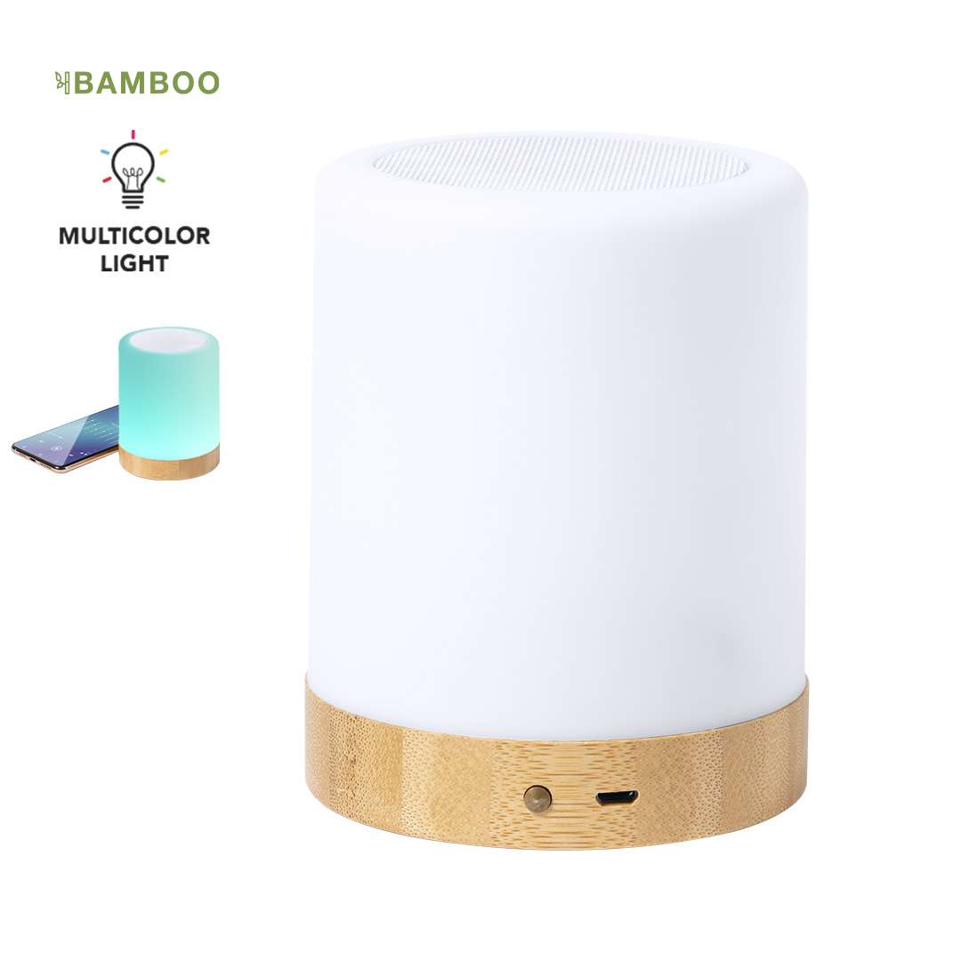 Cassa della linea Natura, prodotta con una combinazione di bambù e resistente ABS. Con tecnologia LED intelligente e connessione Bluetooth® 5.0. Grazie alla tecnologia ILT Smart LED, basta premere con le dita sulla parte superiore dell'altoparlante per cambiare il colore e l'intensità della luce LED come si desidera, combinando le 4 posizioni di luce disponibili. 3W di potenza e piedini in gomma antiscivolo sulla base. Confezionata in un'attraente scatola di eco design.