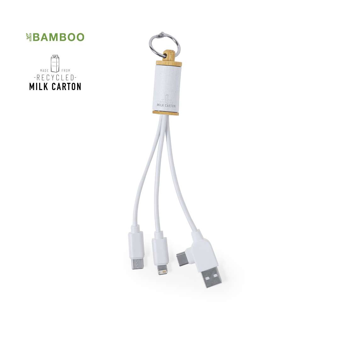Cavo di ricarica realizzato in una combinazione di bambù e materiale riciclato dai cartoni del latte. Include una doppia connessione USB/Tipo C + connessioni Micro USB, Tipo C e Lightning. Con anello di trasporto originale e logo cartoni del latte riciclati. Presentato singolarmente in una scatola dal design kraft, con carta protettiva inclusa. 5V DC 2,4A.I cartoni del latte sono fatti principalmente di cartone e alluminio. Durante il processo di riciclaggio, i diversi materiali di imballaggio vengono separati per essere riutilizzati e riutilizzabili, contribuendo così all'infinito percorso dell'economia circolare. Questo materiale è caratterizzato da un alto grado di riciclabilità, oltre che da leggerezza e resistenza.Materiali come il bambù favoriscono l'utilizzo di materie prime naturali, riducendo le emissioni inquinanti. Proviene da una pianta altamente resistente e versatile, con una rapida crescita e rigenerazione, che lo rende un'ottima alternativa all'uso del legno tradizionale.Prodotto in conformità alle norme RoHS, con un sistema di bloccaggio per evitare cortocircuiti.