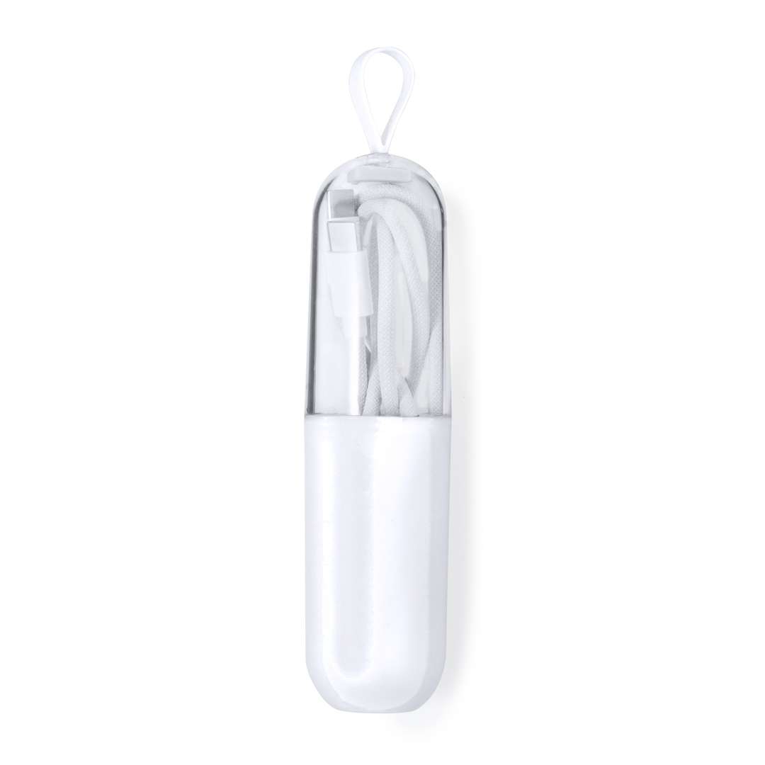Cavo di ricarica con doppia connessione Type-C. Potenza di 65W e adatto al trasferimento di dati. Lungo 100 cm, con connettori in alluminio e presentato in un'attraente custodia con una parte trasparente e una opaca. Con maniglia per il trasporto e presentato singolarmente in una borsa riciclata.