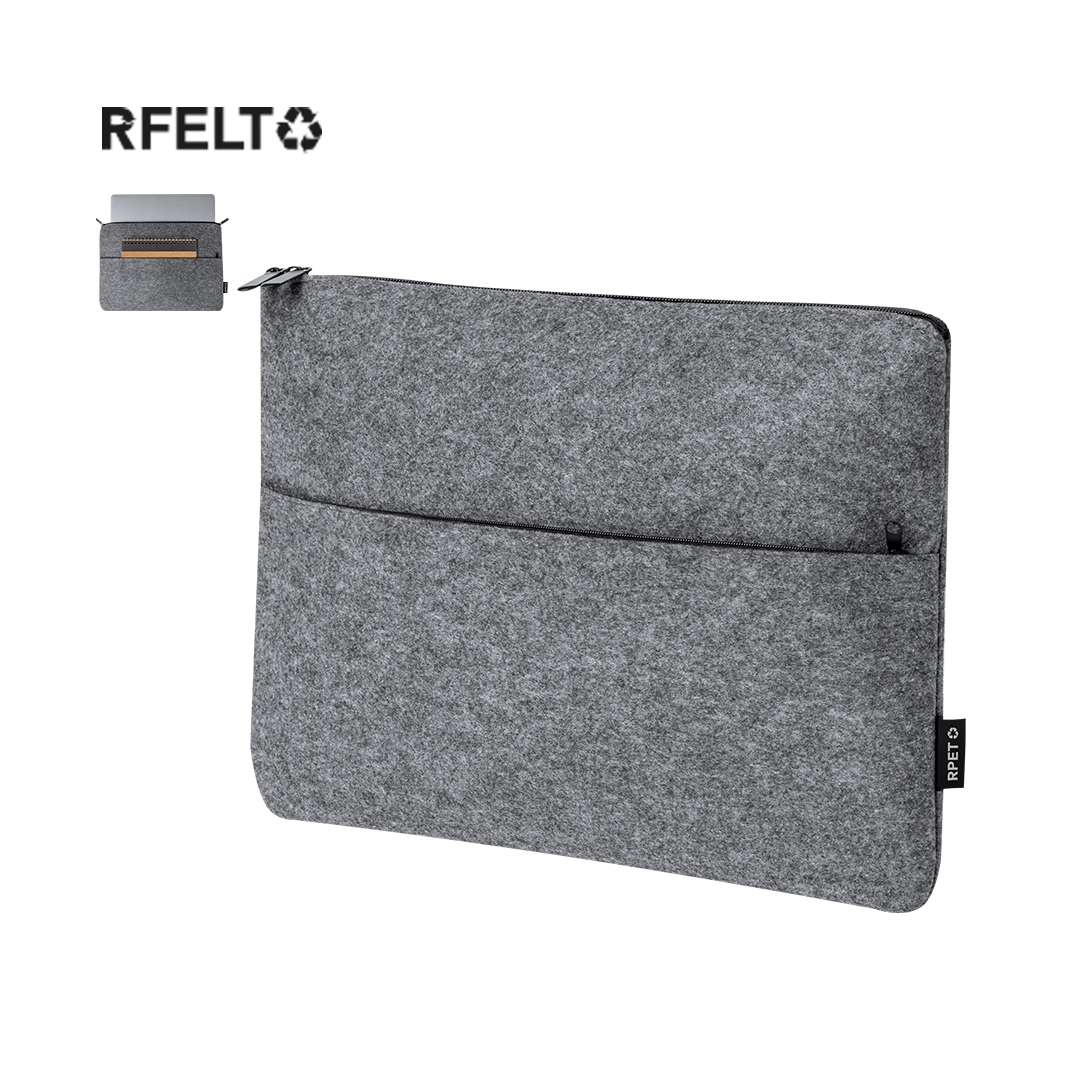 Custodia per computer portatile in feltro RPET. Tasca principale imbottita con chiusura a zip, per laptop fino a 15", e tasca frontale per oggetti più piccoli. Logo RPET sull'etichetta. Il feltro RPET è il risultato della combinazione del processo di riciclo delle materie plastiche con la tecnica millenaria di produzione del feltro, dando vita a un materiale di eco-tendenza che, oltre a essere di origine riciclata, diventa anche riciclabile.
