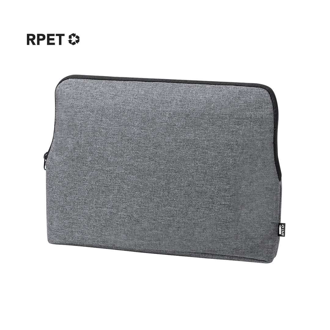 Custodia per laptop della linea Nature line in resistente RPET 600D effetto melange, realizzata in plastica riciclata per favorire il riutilizzo dei rifiuti plastici e contribuire alla sostenibilità del pianeta. Dettagli neri e scomparto principale con cerniera. Interno completamente imbottito e foderato, con logo RPET sull'etichetta esterna.